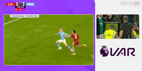 在VAR回看之后,主裁判推翻了此前判给曼城进球的决定。